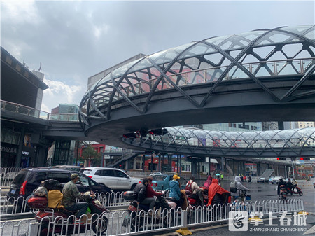 网红“甜甜圈”下人民中路和青年路交叉口的车流也渐渐增多,相较于开车,昆明人似乎更喜欢骑电动车上班。