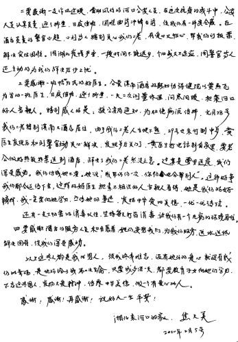 第二封信来自于湖北随州的毛庆爱,在解除留验观察离开滇南酒店时,他拿起酒店的服务指南,在背面写下给河口镇党委副书记、镇长崔敬一的感谢信。