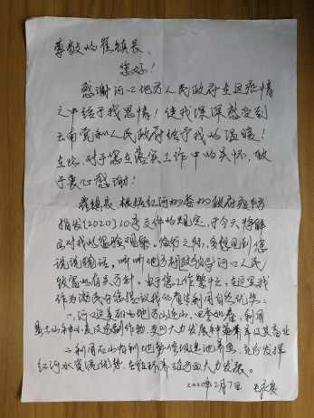 感谢信的最后,毛庆爱还建议河口利用自然优势大力发展种养殖业。据悉,毛庆爱已于2月8日上午9时乘火车离开河口。