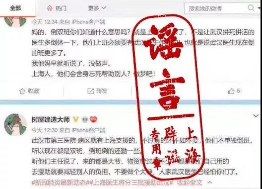 2月9日,多条微博用户“@树屋建造大师”的言论截图在网上流传。其称,上海支援武汉第三医院的医疗队不仅没有减轻武汉医院的负担,反而要求武汉医生排双班,自带物资也不分给武汉医生,让武汉医生怕了。消息在流传时,引发大量网友关注和激烈讨论。