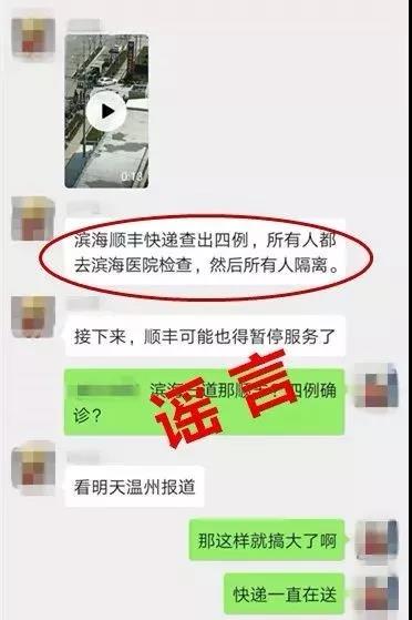 近日,在温州本地微信群、朋友圈里流传着“滨海顺丰快递查出四例,所有人都去滨海医院检查,然后所有人隔离”等不实言论,引发部分民众恐慌与担忧。