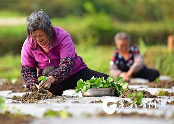 在遵义,汇川区高坪街道新拱村的村民在面积达1113亩的烂坝子坝区戴着口罩,挥着锄头,忙着给新种的花菜苗除草……