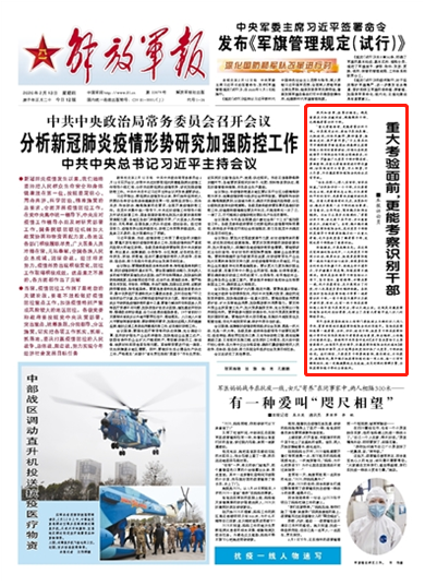 军队各级党委和政治工作部门要把树立正确的识人用人导向,贯穿体现到打赢疫情防控阻击战的实践中。坚持在疫情防控第一线考察、识别、评价、使用干部,把党员干部在疫情防控斗争中的实际表现作为考察其政治素质、担当精神、工作能力的重要内容。要按照中央军委印发的《关于坚决贯彻习主席重要指示,加强军队党的领导、打赢疫情防控阻击战的通知》要求,加强组织领导,充分发挥各级党组织和广大党员、干部积极作用。我们相信,只要党员干部勇挑重担、敢打硬仗,不怕疲劳、连续作战,集中精力把疫情防控的每一项工作、每一个环节都做到位,就一定能凝聚起众志成城、共克时艰的磅礴力量,夺取疫情防控斗争的全面胜利。