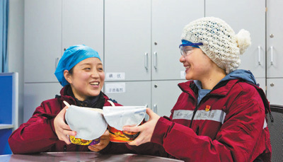 2月9日,中南大学湘雅二医院援鄂医疗队护士周杰楠(右)在武汉度过了29岁生日。在紧张的工作间隙,她与同样是当天过生日的同事曾艳一起吃方便面当做庆祝。
