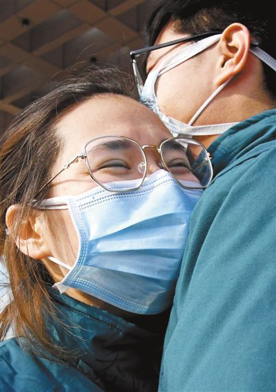 河南省直第三人民医院的刘光耀(右)和乔冰是一对“90后”情侣,一起报名参加援鄂医疗队。2月2日,医疗队出发前,两人拥抱着相互鼓劲。
