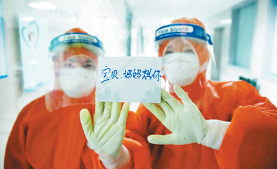 在湖北省十堰市郧阳区人民医院感染科,28岁的护士焦娇坚守在隔离病区,偶尔才能与3岁的女儿视频通话。图为焦娇(左)与同事将写有“宝贝,妈妈想你”的纸条贴在玻璃上。