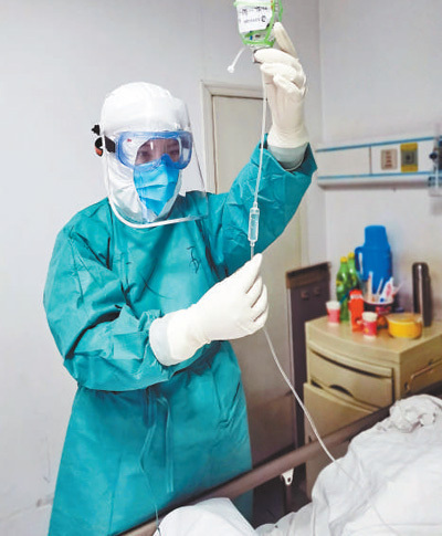 中山大学孙逸仙纪念医院呼吸内科二区“90后”护师袁汉珍,与同事一起驰援武汉市汉口医院,坚守病患救治一线。图为袁汉珍正在为病人输液。