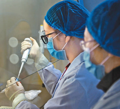 重庆市长寿区疾病预防控制中心“90后”女检测员文纤纤(左)、杨涵与病毒“零距离”对峙,持续战斗在新型冠状病毒PCR检测室,为患者的诊治争取了宝贵时间。图为两位检测员在提取化验结果。