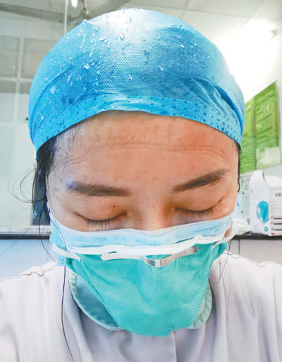 武警湖北总队医院卫生防疫科“90后”护士肖瑞,坚守在防疫一线已有20多天。图为忙碌了一天的肖瑞,走出病房脱下隔离衣,豆大的汗珠挂满一次性工作帽,额头上的勒痕清晰可见。