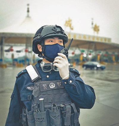 四川成都市青羊区公安分局民警杨桐今年28岁,新婚不久的他投入防疫一线,在高速公路收费站执勤,每天平均盘查1000余台车辆,为2600余人测量体温。图为2月12日,杨桐在岗位上通过对讲机与同事沟通工作。