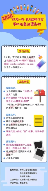 2020年在一场没有硝烟的战斗中到来。这个春节,有的人冲在一线,不畏惧,不退缩;有的人陪在家人身边,不添乱,不恐慌。每一个人都是战“疫”中的战士,都在用自己的方式和新型冠状病毒肺炎战斗着。在等待春暖花开的日子里,所有战士都需要一个平台讲述自己的战“疫”故事,都值得拥有自己的封面展示出战斗的身姿,都有机会为昆明代言,代言不服输、不放弃的春城力量!即日起,2020年云南·昆明网络文化节系列活动之“抗疫一线·我为昆明代言”手机形象征集活动全面启动。活动由中共云南省委网信办、中共昆明市委网信办、昆明市文明办指导,昆明市网络文化协会主办,掌上春城承办。
