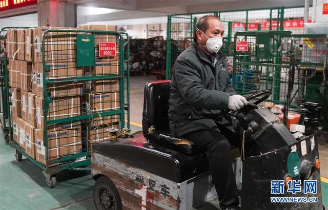 1月27日,武汉邮区中心局邮件处理中心的职工在运送物资,准备向目的地址分发。 新华社记者 程敏 摄