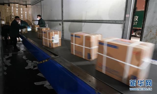 1月27日,武汉邮区中心局邮件处理中心的职工在卸货分拣援助物资。 新华社记者 程敏 摄
