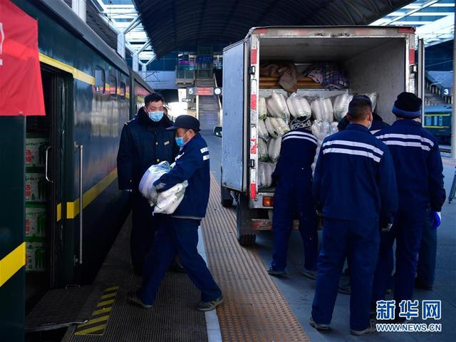 2月1日,在兰州车站,中国铁路兰州局集团有限公司工作人员在搬运援助武汉的疫情防控物资。 新华社发(徐凌波 摄)