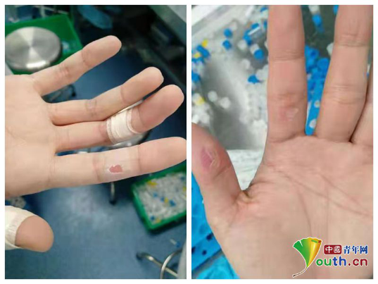 很多人的手上都贴满了创可贴,肩膀、颈椎、手臂、脚踝处贴上了膏药。为了拧紧标本采集管上的瓶盖,在前期缺乏自动化设备的情况下,他们需要人工操作,一个一个拧紧。尽管手上有薄膜手套、橡胶手套、棉手套三层防护,又垫了棉花和纸,但是依然防止不了手指起泡、磨破,在手指上生出厚厚的茧子。