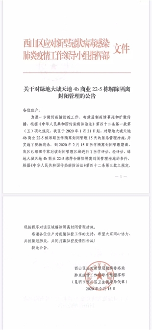 2月15日,记者从西山区应对新型冠状病毒感染肺炎疫情工作领导小组指挥部获悉,西山区疾控中心对绿地大城天地4b商业22-5栋封闭区域进行及时消毒和终末消毒,经专家评估达到解除隔离观察的条件,按程序从2020年2月15日起解除对绿地大城天地4b商业22-5栋的隔离封闭措施。以下是公告全文