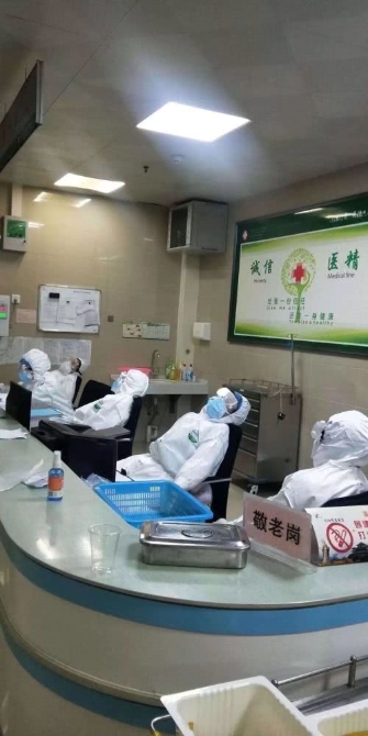 我又编了第二个“谎言”,告诉老婆说,自己接触了疑似病患,害怕被感染,只能先睡在快递仓库暂时隔离7天,没问题才能回家。开始老婆不听我解释,哭得稀里哗啦,后来情绪稳定后,才算同意。而慢慢的,和医护人员接触多了,我开始明白她们为什么轮休的时候,宁愿走路也要回趟家。事实上,在全国医疗救援队来之前的一个星期,金银潭医护人员都是连夜奋战,能睡到床的人有10%,剩下的都是靠椅;病人的呻吟声、对讲机24小时呼叫,持续待在这样的氛围里,任何人精神上都难以承受,更别提好好休息了。所以,即便在路上走4个小时,对她们来说,也是短暂的休息。
