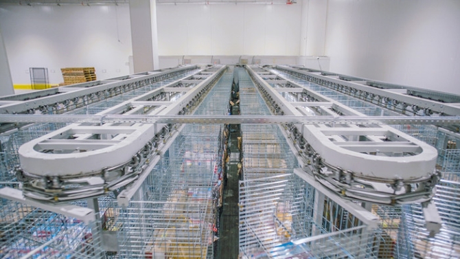 图片为京东位于武汉的大型冷库旋转货架系统之一