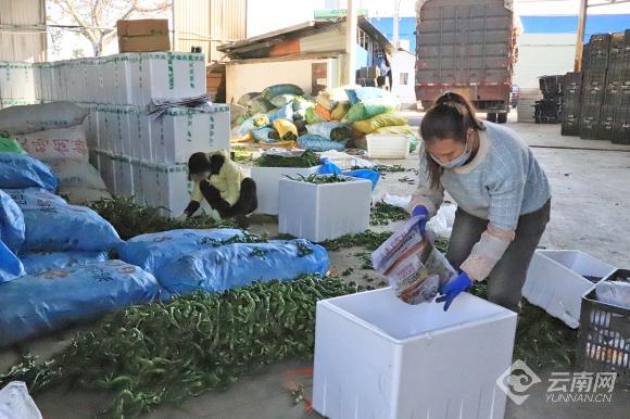 工人们忙着给各类新鲜蔬菜进行分拣、装箱。