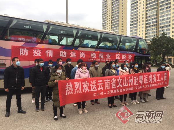 当日,由文山州人社部门组织的赴粤返岗务工人员欢送仪式在文山市主会场举行,文山市25名农民工统一乘坐大巴赴粤返厂务工,同批赴粤务工的还有广南县、麻栗坡县的31名务工人员。全州首批56名农民工2月16日启程返厂上班,拉开了今年文山州农民工外出务工的序幕。