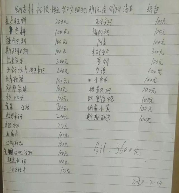 可她心中依然牵挂着战斗在武汉最前线的白衣天使们,她说我们这里缺乏能够供应疫区白衣天使们的物资,那我们就捐款,每人拿出一点自己的心意,通过正当渠道汇给疫区姐妹,让她们购买自己需要的物品,为前线的英雄们尽自己的一份微薄之力,村民们纷纷表示赞成,用半天时间就募集了14210元。