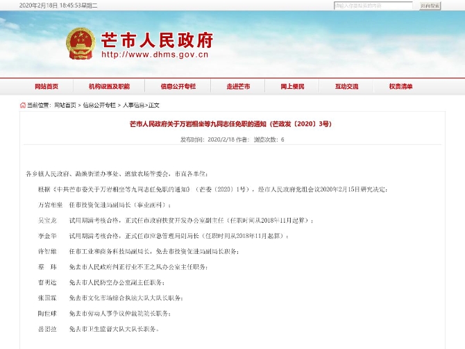 根据《中共芒市委关于万岩相坐等九同志任免职的通知》(芒委〔2020〕1号),经市人民政府党组会议2020年2月15日研究决定:
