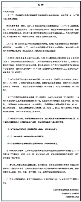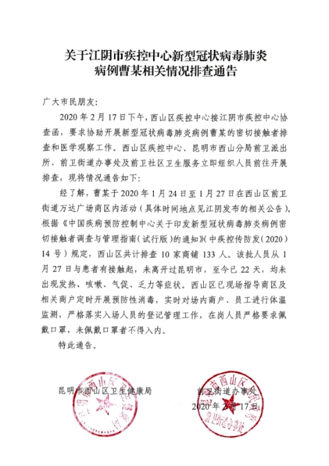 2月17日,昆明西山区发布《关于江阴市疾控中心新型冠状病毒肺炎病例曹某相关情况排查通告》,通告显示:2020年2月17日下午,西山区疾控中心接江阴市疾控中心协查函,要求协助开展新型冠状病毒肺炎病例曹某的密切接触者排查和医学观察工作。