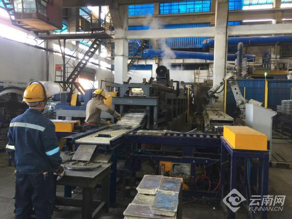 在云铜锌业的生产车间,刚刚成型的高温锌锭从流水线上一块块滑出,机械臂灵巧地将锌锭码成垛子,车间工人则开着叉车迅速将锌锭垛子运走送往仓库。