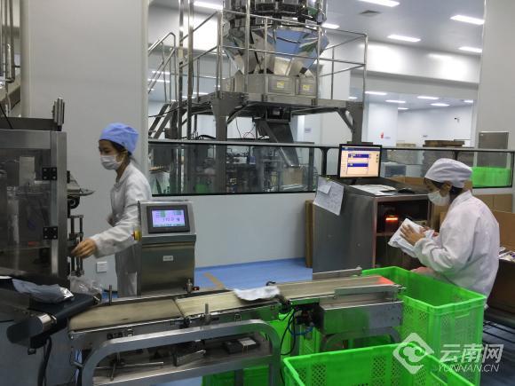 在昆明中药厂一包包中药成品被封装好后,从传送带上递到检测人员手中,旁边的临时储存区,码成小山的蒲公英颗粒正待被送往全国各地。
