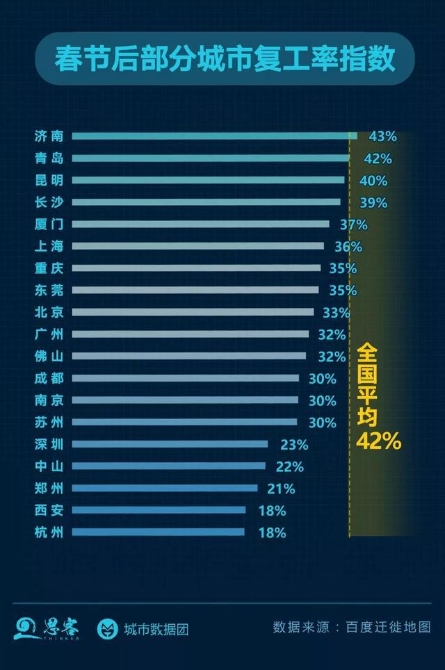截至2月14日,全国平均复工率约为42%,云南、湖南、贵州、西藏等地的复工率指数较高,约为70%。江苏规上企业复工率居全国首位。但近期全国迁入人数较多的北京、上海、广州、深圳、成都五座城市,复工率均不足40%。据新华视点报道,相当多生产企业的实际复工率在30%至40%。一些企业负责人认为,未来一周,第二产业全面复工难度较高,到2月底,有效复工可望达80%。