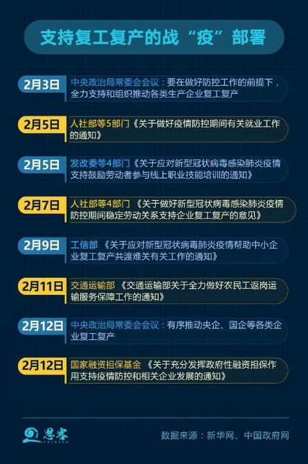 2月12日,中央政治局常委会会议提到了7次“生产”和3次“复工”。疫情防控关乎生命,复工复产关系生计。“抗击疫情前线”和“经济发展前线”并驾齐驱。