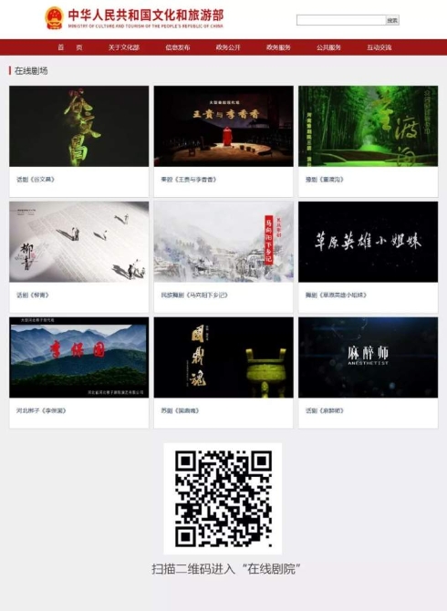 目前,文化和旅游部正在推出“在线剧院”,集中展示一批优秀舞台艺术精品,包括,音舞类:舞剧《草原英雄小姐妹》、民族歌剧《马向阳下乡记》,戏剧类:话剧《谷文昌》、话剧《柳青》、话剧《麻醉师》、闽剧《生命》、秦腔《王贵与李香香》、豫剧《重渡沟》、苏剧《国鼎魂》、河北梆子《李保国》等。近期还将陆续推出在线群众文化、在线少儿文化艺术、在线非遗展示等专栏,不断丰富线上文化内容。