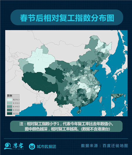 为了计算出各个城市的线下复工率,思客通过各个城市内部的人流活力恢复情况,得出一个近似于线下复工程度的复工率指数。为了排除城市产业结构、外来劳动力依赖等因素对复工率的影响,思客将2020年和2019年的复工率做一个比较,得出城市相对复工指数,昆明市的复工率为40%,位列第三。