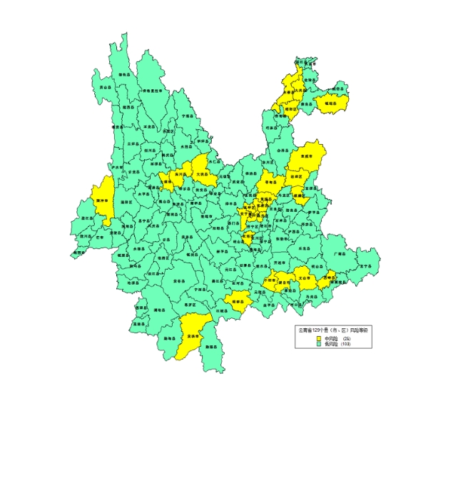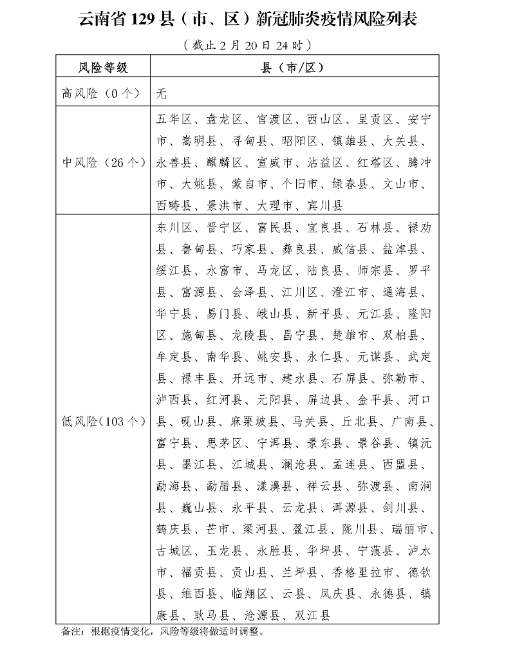 截止2月20日24时云南省129县(市、区)新冠肺炎疫情风险列表
