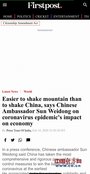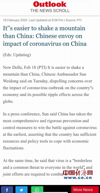 2月18日,中国驻印度使馆在新德里举办新冠肺炎疫情防控的媒体吹风会,驻印大使孙卫东在吹风会上以三个关键词信心(Confidence)、真情(Compassion)和合作(Cooperation)为主线,强调中国必将打赢疫情防控阻击战。孙大使说,疫情爆发以来,包括印度朋友在内的很多外国友人都在为武汉加油,为中国加油。我们感谢大家,也有必胜信心。信心来自于中国共产党的强大领导力(Strong Leadership),来自于中国集中力量办大事的强大行动力(Strong Actions),来自于坚韧不拔、勇于牺牲的中国人民(Strong People),来自于中国雄厚的经济实力(Strong Economy)。我们也完全有信心保持中国经济的长期稳定发展。撼山易,撼中国难。