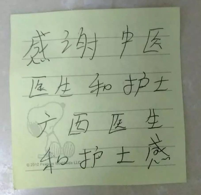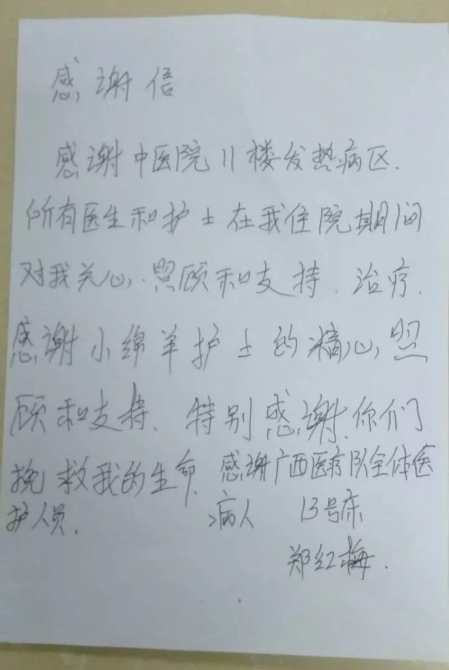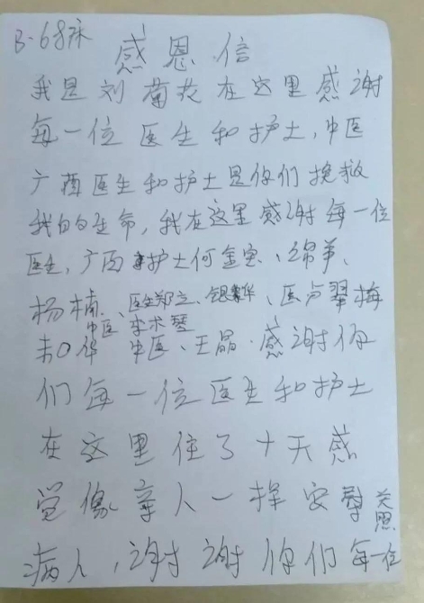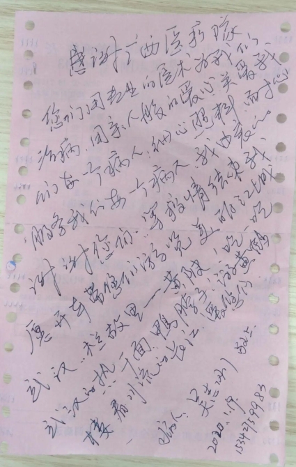 截至2月19日,广西首批支援湖北抗疫医疗队,累计收治病人数为260例,其中重型人数77例,危重症人数43例,已治愈出院人数41例。病人写的感谢信接踵而至,他们发自肺腑感谢医护人员的悉心照顾。