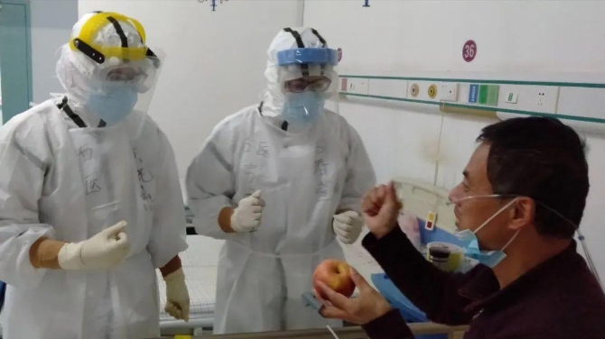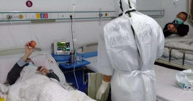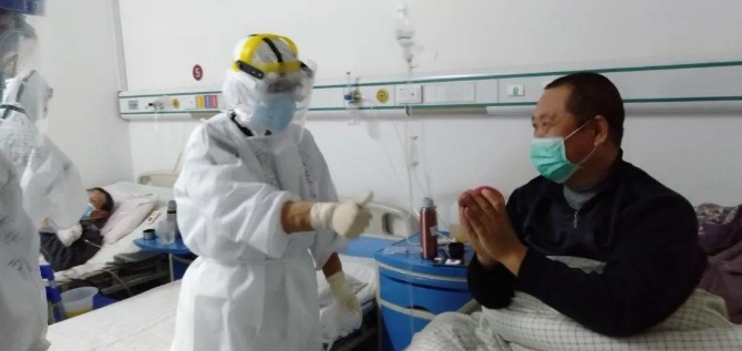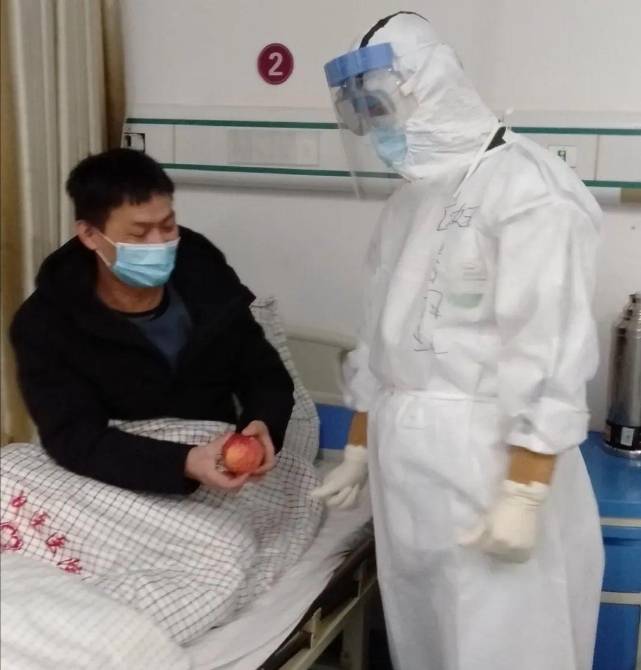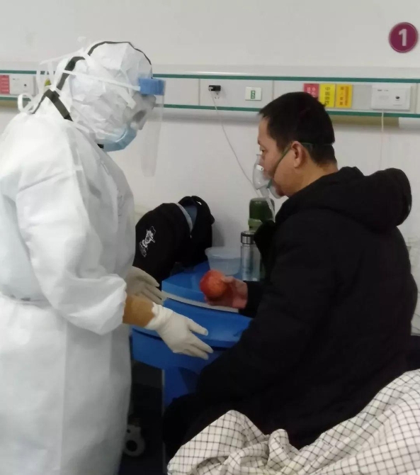 医护人员对病人的照顾无微不至,当听到有病人说好久没能吃到水果时,医疗队的队员就把酒店给自己的餐后苹果节省下来,拿到隔离病区分发给病人。