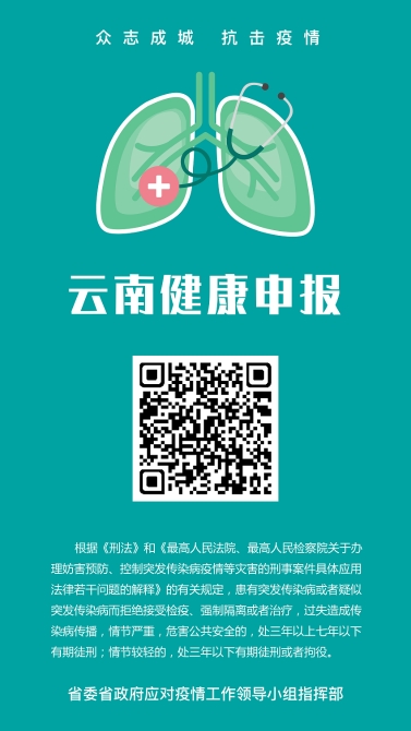 根据《云南省应对新冠肺炎疫情分区分级防控的实施意见》(云南省应对疫情领导小组指挥部第10号通告)要求,所有入滇人员须申报个人健康状况。为此,自2020年2月22日起,全面启动“云南健康申报”系统。