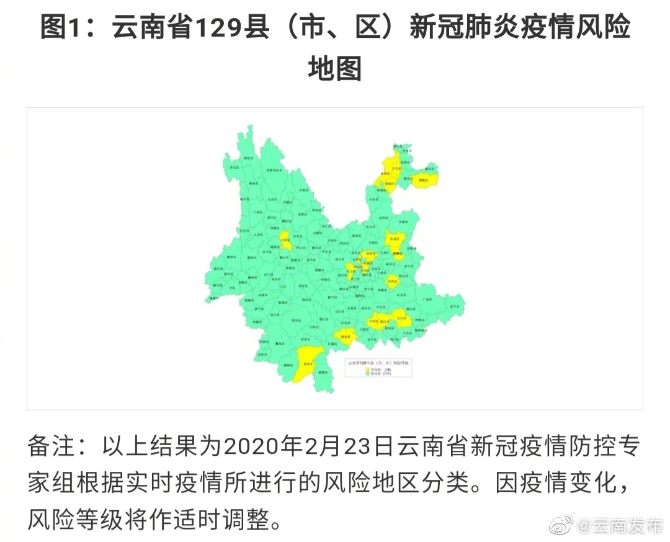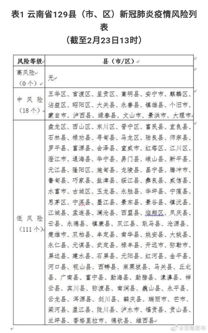 昆明信息港讯 机器人小明 2月23日,云南省卫生健康委员会发布了调整后的云南省129个县(市、区)新冠肺炎疫情风险列表。