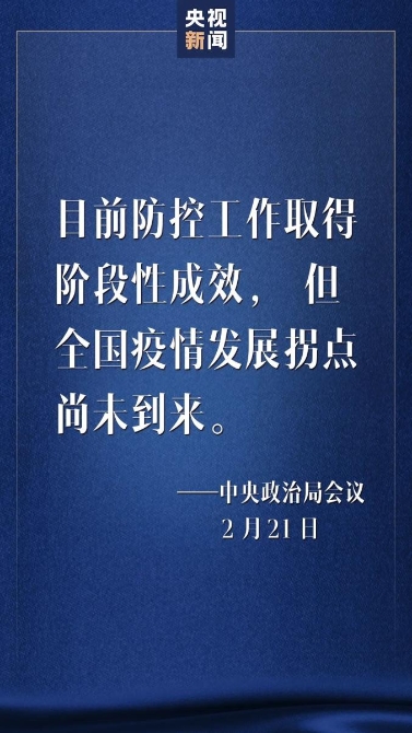 2月21日召开的中央政治局会议作出冷静判断——虽然疫情防控工作取得阶段性成效,但“全国疫情发展拐点尚未到来”。围绕“拐点”,我们大家至少应有三个共识: