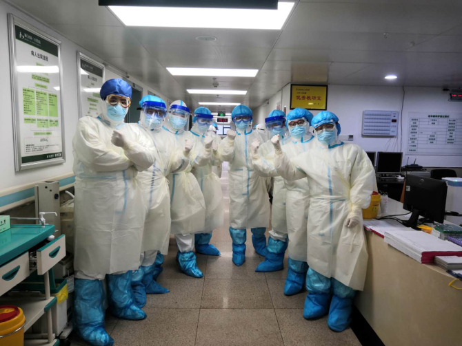2月14日,浙江省对口支援湖北荆门医疗队队员、浙江大学医学院附属邵逸夫医院医护人员为自己加油鼓劲。