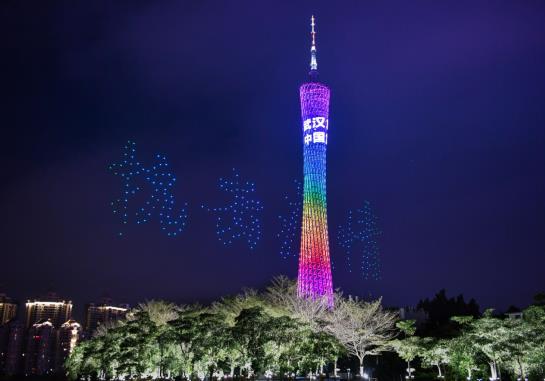 2月9日凌晨,广州珠江上空的无人机编队组成“抗击疫情”字样。