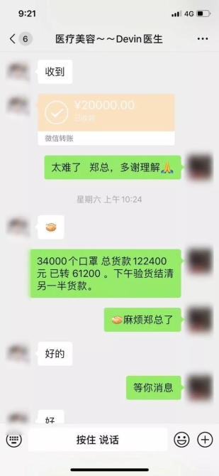 2月7日晚,吴先生从朋友处得知一名“医疗美容医生”Devin销售一次性口罩,便添加了对方微信好友。