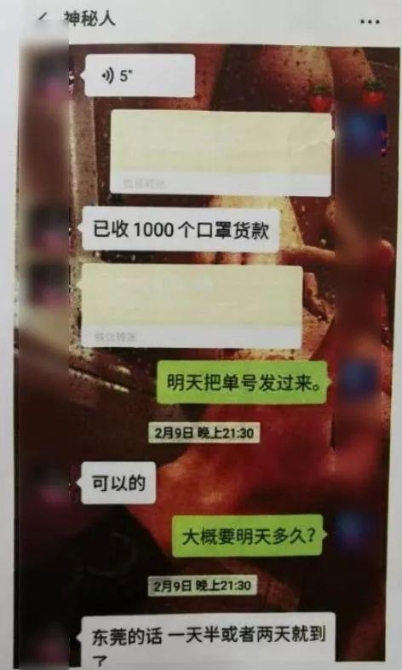 2月10日,刘先生在微信上购买了5100个口罩,对方保证1至2天便可收到货,于是刘先生痛快地支付了11220元。