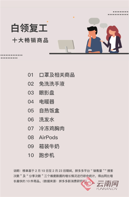 日前,拼多多对平台消费数据尤其是三线以上复工密集城市的消费数据进行了分析,得出“白领复工10大热销商品”榜单。其中,既有口罩及相关衍生品,又有自热饭盒、眼影盘等解决吃和用的商品。