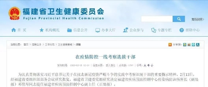 在疫情防控中,为进一步加强福建省疾控中心的领导力量,福建省卫健委党组向福建省委组织部建议,提任邓艳琴为省疾控中心副主任。福建省委组织部第一时间派出干部考察组深入疫情防控一线,对邓艳琴的一贯表现特别是在疫情防控中的实际表现等方面,进行近距离、全方位、多角度的深入考察和了解。考察之后,福建省委组织部立即研究批复了邓艳琴的任职。