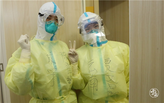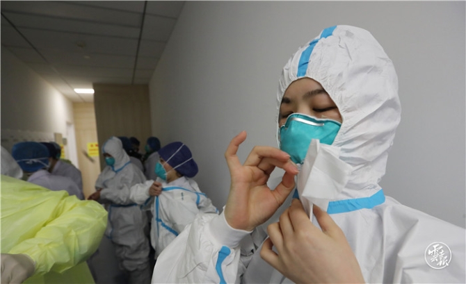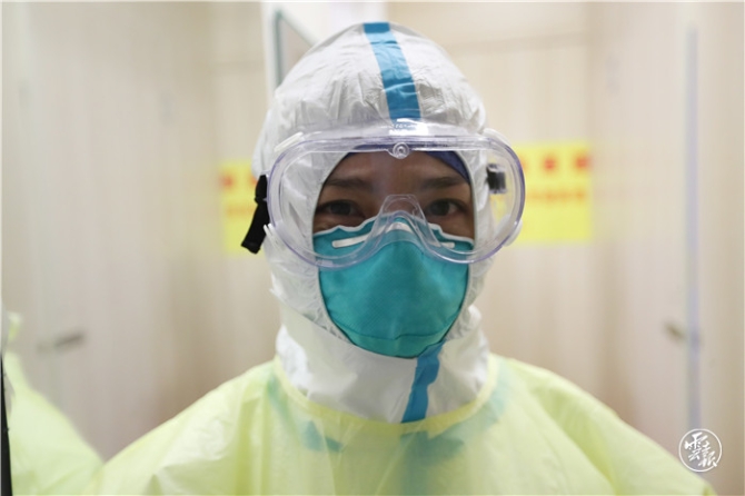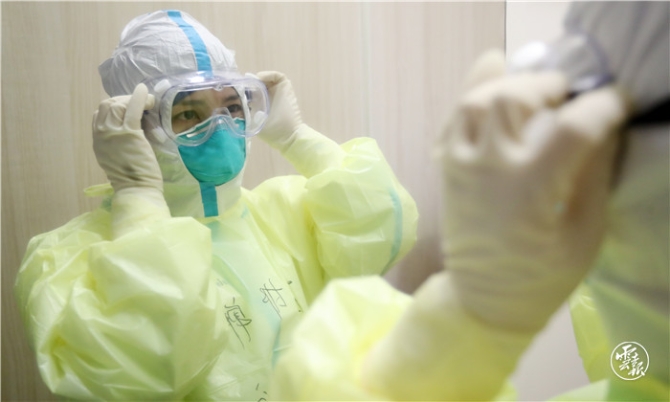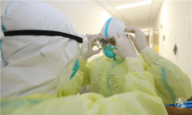 病房外的缓冲区内,早班护理人员正在抓紧时间严格按照十个步骤进行防护服穿着,每一步都要严格操作和检查,以确保个人防护安全,戴上护目镜,写上名字后,大家相互加油鼓劲着走进监护病房。