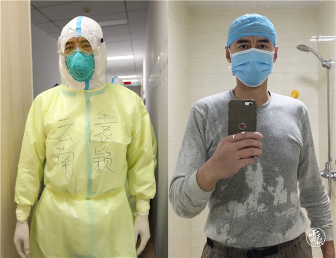 走出重症监护室,队员杨彦红面部满是压痕,眼镜上还留有汗珠和水汽。