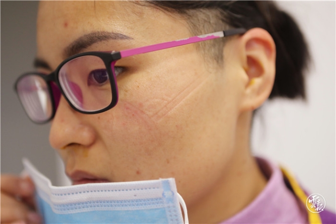队员王涵面部的口罩压痕。