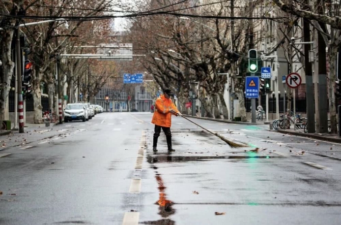 武汉街头,清洁工正戴着口罩扫地